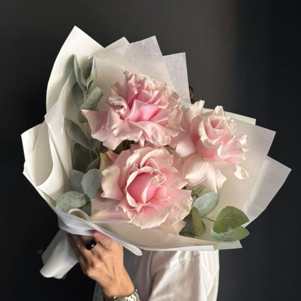 Розы французские-3 шт./эвкалипт/упаковка/лента.