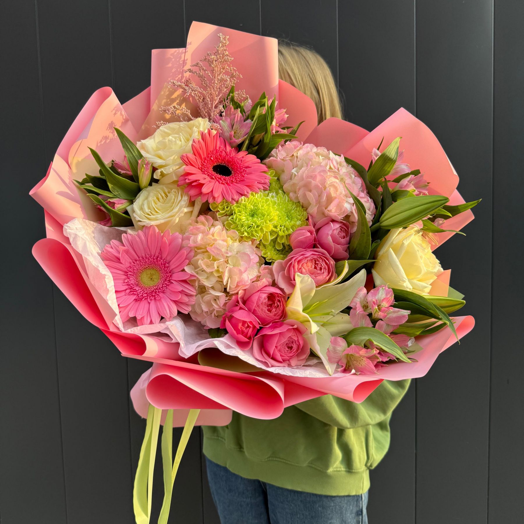 Герберы/гортензии/альстромерии/розы кустовые/розы одноголовые/лилии/упаковка/лента.