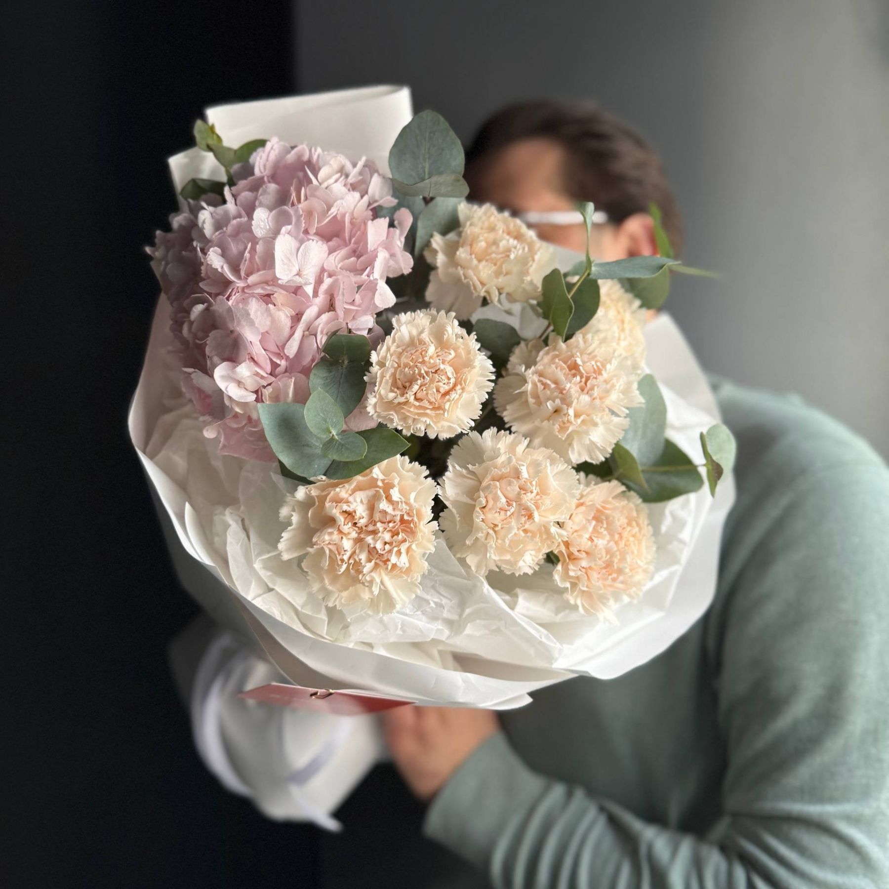 Гортензия сортовая- 1 шт./диантусы-7 шт./эвкалипт/упаковка/лента.