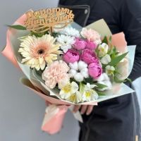Роза кустовая/хризантема кустовая/гербера/альстромерия/диантус/хлопок/топпер/тишью/упаковка/лента.