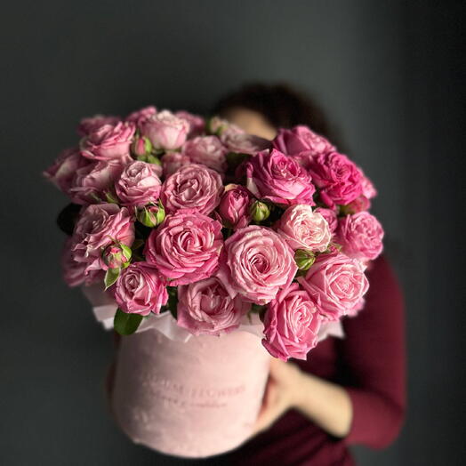 Розы кустовые-6 шт/шляпная коробка/тишью/оазис.