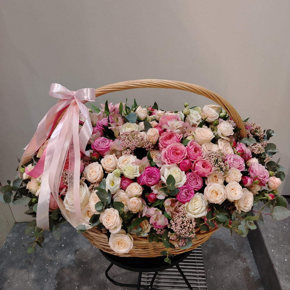 Розы кустовые-15 шт/альстромерии-10 шт/озотамнус-10 шт/эвкалипт/оазис/корзина/лента.